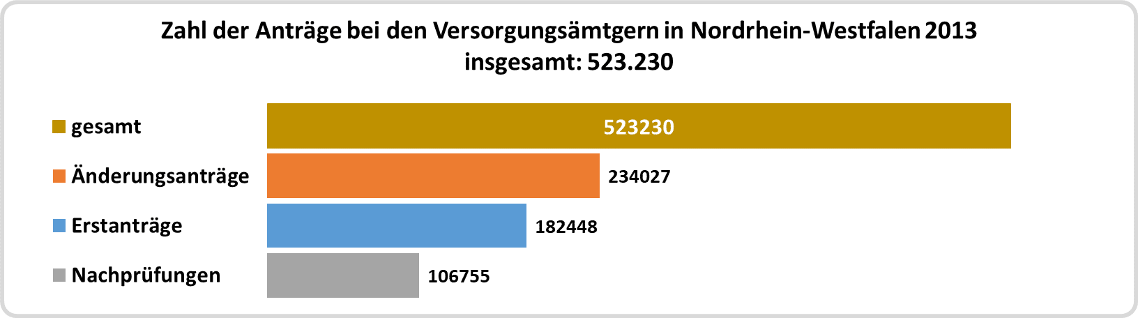 Im Rahmen des SGB IX wurden bei den Versorgungsämtern des Landes Nordrhein-Westfalen im Jahr 2013 insgesamt 523.230 Anträge gestellt (Erst- und Änderungsverfahren sowie Nachprüfungen, s. o. Bericht an den Landtag, Seite 6). Die Anträge setzten sich wie folgt zusammen: