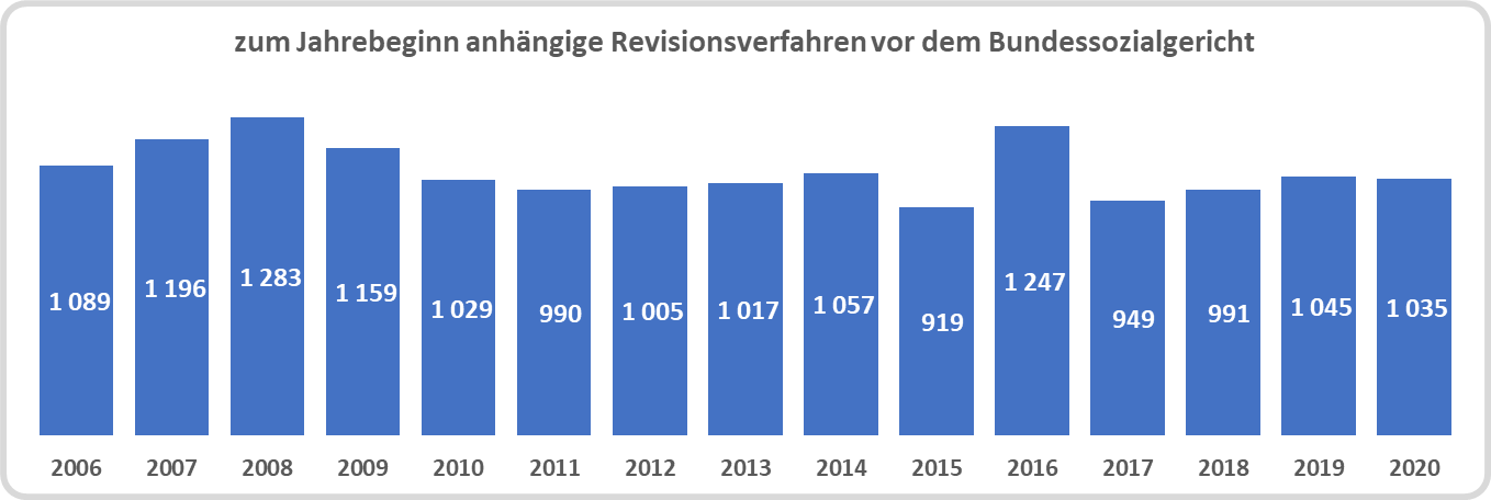 Die Zahl der Revisionsverfahren vor dem Bundessozialgericht ging von 2006 bis 2020 von 1 089 auf 1 035 leicht zurück.