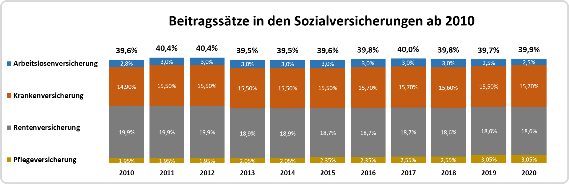 Die nachfolgende Tabelle zeigt die Entwicklung der Beitragssätze der Arbeitslosenversicherung, der Krankenversicherung, der Rentenversicherung sowie der Pflegeversicherung in der zeitlichen Entwicklung ab 2010. Die Gesamtbelastung liegt in den letzten zehn Jahren zwischen 39,5 und 40,4 % (ohne den Zusatzbeitrag bei der Krankenversicherung und ohne die Beiträge zur gesetzlichen Unfallversicherung):